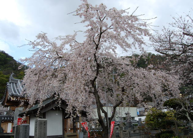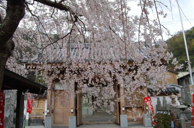 「寺町の大黒さん」と親しまれている徳島七福神の大黒天・ 大門を背景に櫻が映えて見事な花を咲かせています。