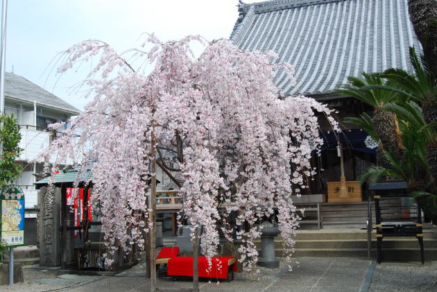東照寺の七福神の「福禄寿」・安宅の通りを少し入った住宅の中で 見事なしだれ櫻の花を咲かせています。