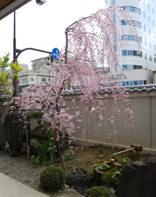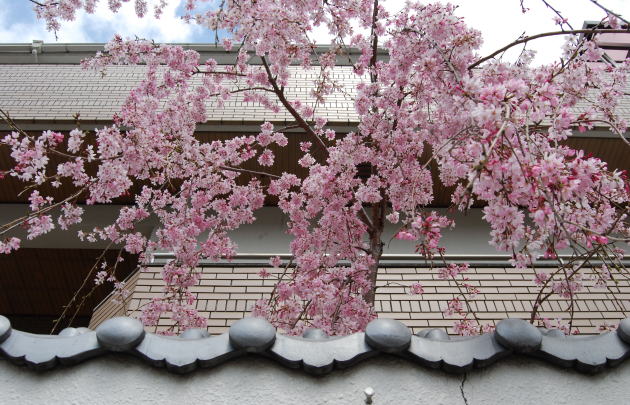 佐古の国道を通っていると日本瓦の上で花を咲かせている しだれ櫻・お寺さんでした。瓦塀の中を見せて頂くと京都を思わせる庭園で櫻も未だ若い木でした。