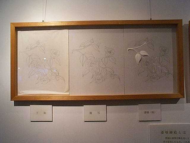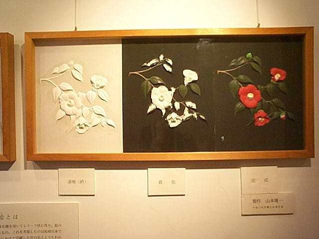 下記の写真は、漆喰芸術の完成までの製作段階である。下絵書き、白土を塗り、着色していく。