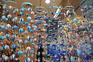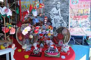| 隣接する勝浦市のひな祭りは、今年で17回目。 このイベントに触発された御宿町は、今年で11回目となる。 御宿町内の商店、協賛店の21店舗が『まちかど「つるし雛めぐり」』の幟旗を店舗前に掲げ、それぞれの工夫の成果を展示していました。 |