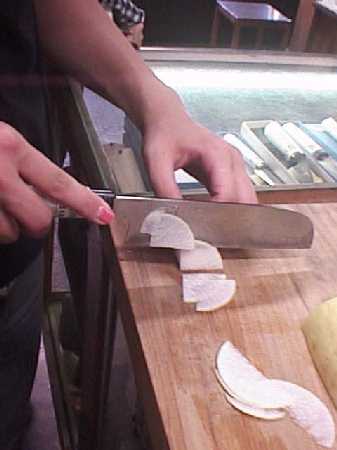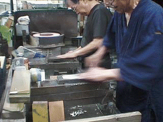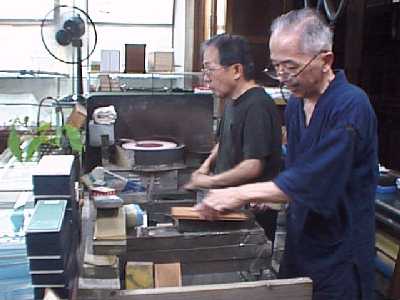 | 店内に一歩入ると,この2人の異常なまでの刃物砥ぎに、息を潜めて見学している。 | |