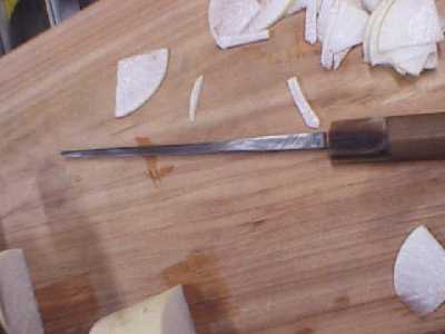 | 研ぎに砥がれた包丁とか。 幅1センチだ! | 朝から晩まで,刃物砥ぎの人生だ。 |