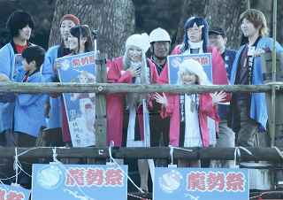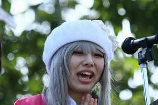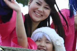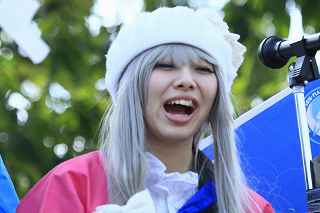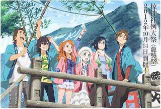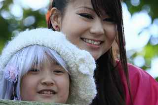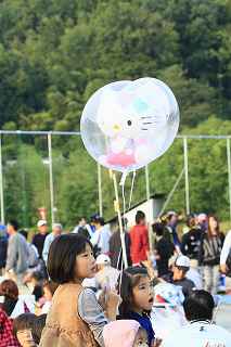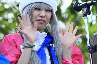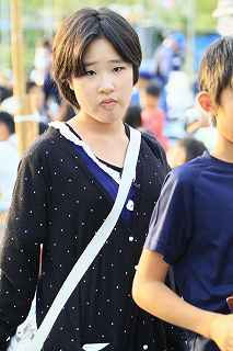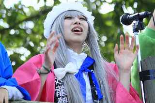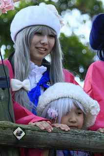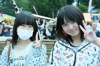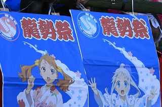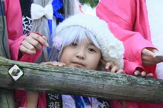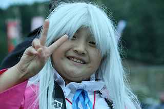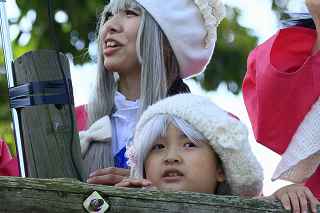| ちょっと違和感のある話だが・・・・・・・。 「あの日見た花の名前を僕達はまだ知らない」と、言う題名のアニメがフジテレビ系列で放映されていたそうだ。 私は全く知らなかったのですが、・・・。 祭り会場で、昼近くなって妙なコスプレの女の子が櫓の上に登り、何やら騒いでいる。 会場内では、少し前からその周辺は、警察の排除も聞かず凄い人だまりができ、ほとんどの人がカメラやビデオを持ってパチパチ撮っている。 私も遠くからテレコン装着した1000ミリレンズのカメラを三脚から外し、撮影したが、カメラが重いのでブレる事、ブレる事。 何枚かものになった写真があるので紹介します。 メンマとかアナルとか言っていたが何の事だか判らない。 東雲流の席に戻って話すと、「秩父を舞台にしたアニメ」で、至る所に秩父の地が出てくるそうです。 そんな訳で、市内の旧秩父橋は有名で、コスプレを着て写真を撮りに来る人をよく見かけるそうです。 また、アニメの全11作のうち、第10話は、タイトルを「花火」としてあるが、明らかに「龍勢花火」をモデルにしているそうだ。 家に戻ってインターネットで検索して見たら、おびただしい数の検索結果でびっくりしました。 なお、来年の夏頃、映画化され劇場公開予定だそうです。 最後に桟敷席で、知り合った美少女たちの何人かにモデルになってもらいましたので、写真集を賑わさせて頂きます。 ----------------------------------------- 彼らの方こそ、一生懸命手造りしたのに、落胆している筈ですが、おくびにもそんな様子を見せませんでした。 撮影日:2012−10−14 椋神社の龍勢祭りにて |