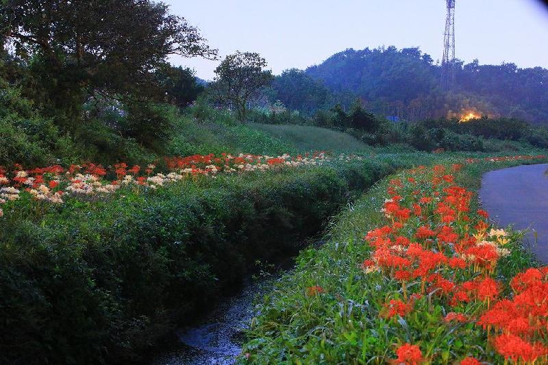 自分も2度ほど撮影には来ているが、5年ほどご無沙汰していた。しかも、今回は夜なのでヒガンバナの密生しているな場所とか撮影スポットなどは暗くてさっぱりわからない。唯一、新藤橋から上流300メートルあたりを撮ったという、看板の写真だけが頼りだったが、実際に行ってみても、看板ほどヒガンバナはなかった。いや、暗くてどこに咲いているのか?何処から撮ればいいのか?見つからなかったと言った方が正しいかも知れない。ヘッドランプ一個では、目先の道の両側に咲いているヒガンバナは確認できても、対岸にどれだけのヒガンバナが咲いているかもはっきりはわからなかった。フラッシュをたくという方法はあるが、EOS5Dにはフラッシュは付いていない。適当に長時間露光をするしかなかった。幸いにも月の光は、それなりに明るかったので、意外と短い露光で済んだ。また風がほとんどなかったことも助かったが、それでもISO感度は6400まで上げての撮影だし、焦点がなかなかヒガンバナに合わなかったりで苦戦した。その割には思ったような色が出せず残念。夜らしくない写真も何枚か出来上がった次第。