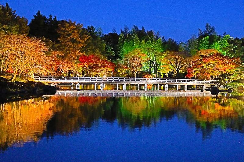 モミジのライトアップは、試験的に昨年から開催され今年は2回目となる。きっと好評だったのだろう!?16時でいったん日本庭園を閉め、16時半から入場料1000円で20時半まで再開する。「1000円は、結構高め設定ですね。」などと師匠と話しながら日本庭園へ向かう。どうしてどうして、入場券売り場では10名ほどの列ができていた。師匠から「途中のモミジに気を取られずに、まっすぐ三脚ポイントへ行け。」とのアドバイス受け、先を急ごうとしたが、混雑で思うように前へ進めない。「西の流れ」付近の黄葉がとてもきれいで、特に橋の上には何十人も人が重なり撮影の順番待ち通過に難儀をした。ほとんどがスマホでの撮影だから入れ代わり立ち代わりの「三密」状態。そこを通り抜けても、人波に従って流れて行くしかなかった。ようやくたどり着いた三脚可能エリアは、最前列に三脚がずらりと並び、その合間から手持ち撮影のシャッター音や、スマホの連写音が聞こえる過密状態。予想通りの混雑だった。一旦ここを通り過ぎ、視界が開けたところで対岸や「木橋」を撮影した後、戻ってみた。しかし、相変わらずの混みよう。中央ポイントで前のカメラマンの撮影が終わるのを待つ方法もあったが、そうすると折角のブルーの空を逃しかねない。仕方なくとりあえずは枝が入ってしまう「端っこ」で撮影を開始。