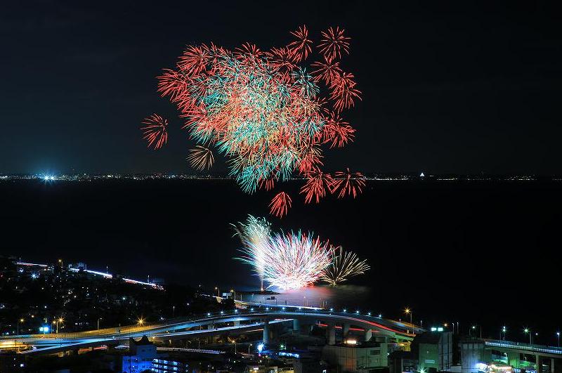 街の明かりが灯り始めると、ここからの眺めは最高潮に達する。夜景が好きな自分は、いつの間にか小田原城のことは眼中から消えていた。18時25分頃再びの雨、仕方なく傘をさしての設定最終チェックとなった。16時30分を5分ほど過ぎたころ、御幸の浜の突堤から花火は上がった。と思ったらなんと早川駅近くの「小田原さかなセンター」付近からの同時打ちだった。一瞬パニックになった。カメラは縦位置アップと横位置広角で臨んでいたが、どちらも御幸の浜一点に焦点を合わせてあった。急いで横位置カメラをずらし、辛うじて両方入る画角に合わせたが、「時すでに遅し」。オープニング花火がロクに撮影できていない。その後、横位置カメラはいつ「対打ち」が来てもいいように置きっぱなしにしていたのだが、プログラム中盤は全く右側からの打ち上げはなかった。そして、エンディング花火になって再び「対打ち」となった。一応対応はしたものの、撮影場所正面(つまり花火と花火の真ん中)に、あろうことかミカンの木が鎮座しているのだ。だから中央は真っ黒で夜景も写っていない。花火が終了したあとモニターを確認すると、間の抜けた冴えない写真が出来上がっていた。そんな時、少し離れて撮影していたフォルクスワーゲン・ビートルのカメラマンが寄ってきて、「右側の撮れましたか?」と聞かれた。とっさに「諦めました!」とは答えておいたのだが・・・。再び雨足が今までになく強くなり、10台ほど止まっていた車も「クモの子を散らす」がごとく(少し大げさ)走り去り、自分だけになった。片付けに入ろうと思いへッドランプが障害物だったミカンの木を照らした時、閃くものがあった。「そうかカメラ内の多重露光で、間の抜けた二か所打ちの真ん中にこいつを入れよう!」そして出来上がったものが、ラストの二枚です。運よく右側の花火がミカンの木に隠れなかったのは、全くの偶然。今思えば、沖合に赤色灯を付けた船が距離を置いて2隻出ていたのだから、おかしいと思わなければいけなかったのだが。まだまだ状況判断が甘いことを痛感した1日でした。