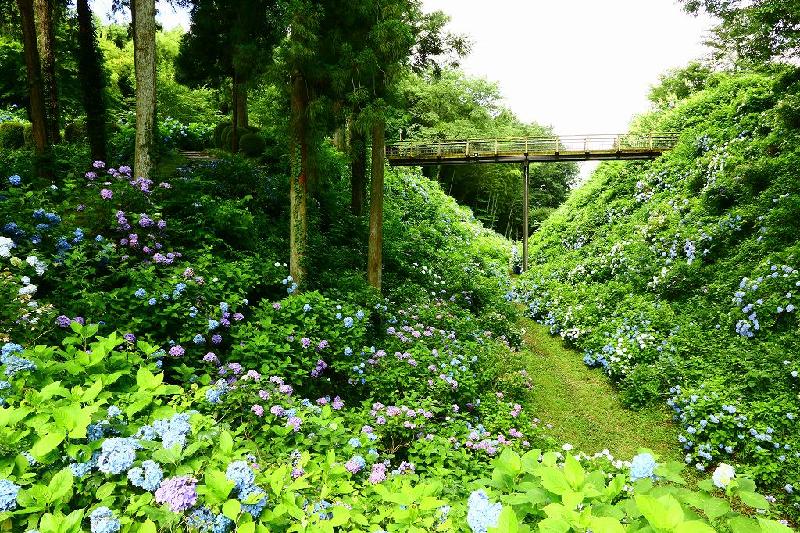 アジサイなら小雨程度でも決行しようと、覚悟を決め、見かったのが関東北部にある城跡。5時に玄関ドアを開けると、東の空に久しぶりの太陽が出ていた。現着8時少し前、メインの駐車場には車が2台止まっているだけだった。HPでも案内されていたのだが、今年は祭り自体が中止、夜間ライトアップも実施されない。よって、ここだけに丸一日滞在することはできない。結果3時間ほどの滞在となった。6000株のアジサイと言っても立地条件による。石段を上がる左右には、丁度見ごろのアジサイが迎えてくれ、未明まで降った雨で、しっとり感があった。本丸広場のアジサイは日当たりのよい半分は既に変色しており、興ざめ。ここのポイントは、深い堀に渡された「紫陽花橋」の上から眺めるアジサイなのだろうか?皮肉にも、天気が異常に良すぎて、青空が見え強い日差しが木々の間から降り注ぐ(生憎の?)天気となってしまった。よって、橋の上から撮った写真は片側が色飛び、もう半分がアンダーとなった。太陽が雲に少しでも隠れるのを待ってしばらく居座る。20分歩で粘った間に日差しが弱まるタイミングを狙ったものを掲載いたします。ついでに橋を渡る人物も待ったが、生憎、人は数えるほど、しかも被写体に向いているような人ではなく、子供かおじいさんおばあさん。この橋の下にある堀にも降りてみたものの、汗をかいただけの満足感は感じなかった。おそらく、自分が城跡の構造やその城主を含めた歴史に関心がなく、ただ単にアジサイだけを撮っているから、こういう歴史的な場所の一歩一歩に意味合いを感じないのだと思う。だから、写真も上手く撮れないのかも知れない。黒羽城址公園の隣には「芭蕉の館」なるものがあったのですが、句碑巡り共々足を運ばず撮影終了。
