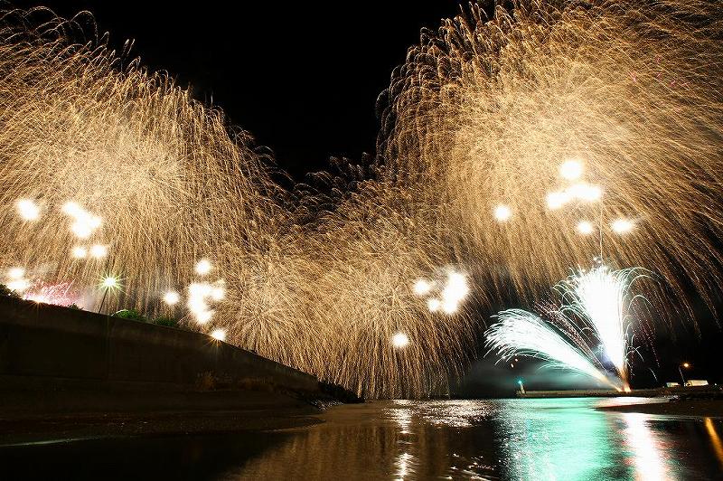 取り敢えず、公園最前の防波堤に三脚を置いてみた。あろうかとか160センチの中型三脚では、岩壁の高さからそれ程頭が出ない。コンクリートの厚みが50センチ以上あり、海面部分が満足に画角に取り込めず。車に戻り大型三脚に変えようと思ったが、大川河川敷に降りて海面反射が狙えるかな?そう思い公園をあとにする。開始1時間前、余りにヒマすぎるのと人がいないので不安が増す。そのうちカップルが「花火どこで上がるのか?」聞いてきた。「ここは初めてだから、わからないけど、多分あの岩壁だと思う。ヘッドライトがチラチラしているので、」と答えたら、「釣り人じゃないですか?」と否定された。確かに一理ある。しかし、動く気はなかった。すでにカメラは2台セットしてしまったし、ここを離れて、ロケハンするには盗難が心配だ。そう決断した段階で、この日の花火撮影は終わっていた。打ち上げ箇所が二箇所だったのだ。