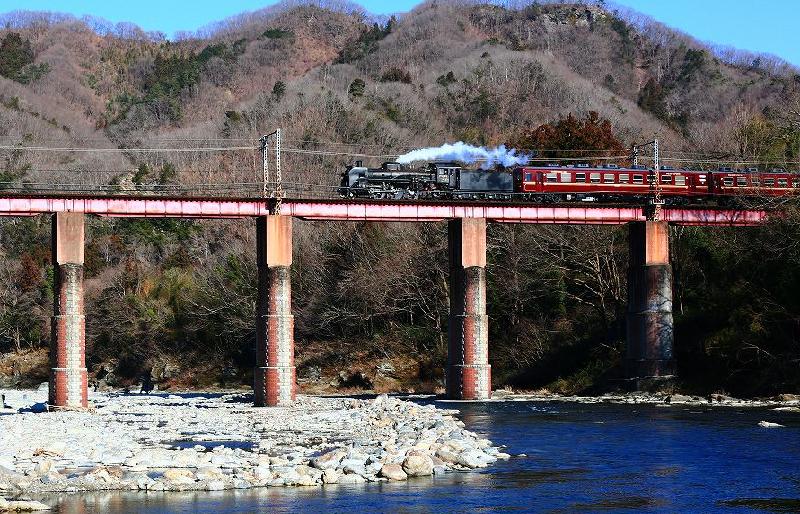 この付近、ライン下りで有名な長瀞に近い。そして、秩父鉄道「上長瀞駅」から荒川を渡るSLは、撮り鉄でなくても一度はカメラに収めたい景色。宝登山から車で10分もかからない場所にあるので、狙わない手はない。問題は、初めての場所故、思いもかけない時間がかかることがあることだ。まずは車を停める場所。目的地近くのGSには500円で止めさせてもらえる場所があったが、できれば黙って停められる撮影地に近い空き地がいいに決まっている。鉄橋近くの細い道は民家が点在していることは、グーグルマップで調査済み。どこかの草むらでもいいから空き地になっているところなら車を突っ込む覚悟で、軽ワゴンで来た。その狙いはぴたりと当たり、廃墟の横にチャッカリ突っ込む。SL通過の30分前だ。「獣道」を無理やり草をかき分け荒川河川敷に出る。既に10人ほどのカメラマンが一直線に三脚を立てていた。その一線は、岩の上だったり、河原の小石の平坦地だったり、極めつけは浅い川の中だったりした。20分ほどSLを待っている間に4本程度通過車両があった。2両編成の電車は完全に鉄橋にちょこんと乗ったおもちゃ風だったり、石灰岩と思われる積み荷を積んだ貨物列車は鉄橋一杯の長い編成で走って行く。SLだけではなく結構楽しめるのでは?と思った。そして、SLが客車を引いて鉄橋を渡り始めた。