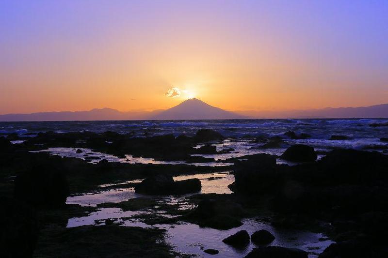 車に戻り、水を含ませたタオルで丁寧にカメラを拭く。ここから岡崎公園までは、ほんの10分と近い。太陽は次第に西に傾きつつあったが、クッキリ度は全然で、輪郭がハッキリしない。期待度は高くなかったが、三浦半島独特の岩がゴツゴツした海岸を前景に、何とかダイヤモンド富士はゲットできました(意外にも沈む寸前は少しマシな視界になっていた)。