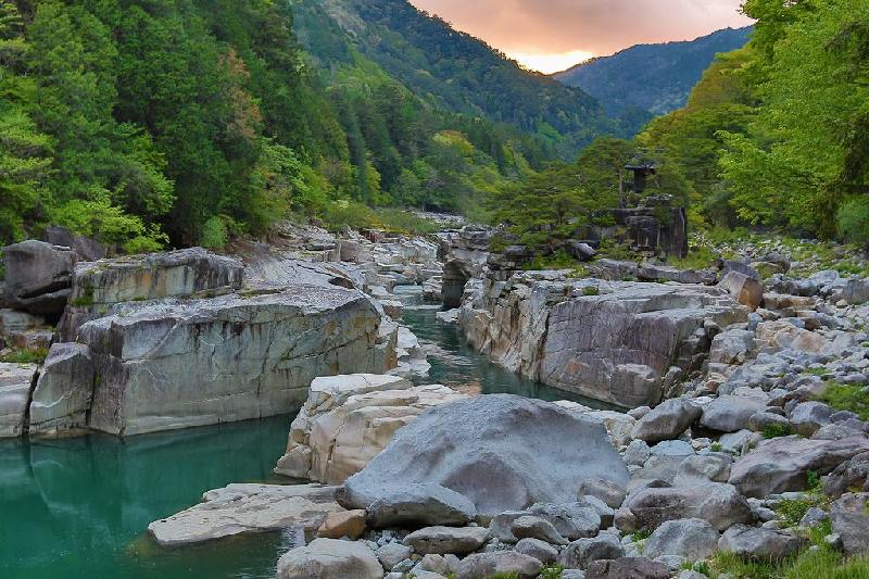 坂を下り右手のガソリンスタンド横の下り坂を下りると上松町営駐車場があり、こちらの方は無料。高度差がないので『目覚めの床』へのアプローチは、木立を通ってすぐに出られる。ところが、歩き始めたころは既に林の中は暗く、ヘッドランプをつけての散策となった。5分ほどで奇岩が並ぶ展望の開けたところに出る。こんな時間一人で立っている人を見て不審に思われないか?それほどこの景色をこんな時間に見に来る変な奴はいそうにないだろうと内心思う。ただ、そういう気持ちが芽生えるのも、この不気味なまでに形の整った直方体の岩や、妙な形の石が変な連想をさせ、とても穏やかな気持ちになれなくさせているからかもしれない。さぞ天気の良い日中に来れば撮影のし甲斐もあるし、岩を渡り歩きながら面白い形の岩の発見や、エメラルドグリーンの川とのコラボも楽しめるのではないかと容易に想像される。