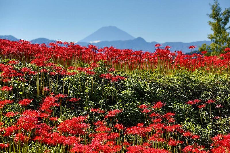 山中湖でパール富士を撮影後2時間ほど粘って赤富士を拝み、その足で昨年春に行った、「塩山ふれあいの森総合公園」まで軽ワゴンを走らせる。ネットでは、どのくらいの彼岸花が、公園のどこに咲いているのか調べられず、「一度行っているからまあいいか」程度でここを選択。高低差のある園内をゆっくり歩きながら、それらしき赤色集団を探すも、群生には程遠い彼岸花しか探せなかった。もっとも自分が勝手にヒガンバナが密集しているのではないかと想像したのが間違え。既に、日当たりの良いところは枯れていたり、人の手が入っていない斜面に、雑草に交じって咲いていたりで、全く絵にならず。第3駐車場の反対側にある水路の両側に帯状に咲いている場所が、ここの一押しだった。結果としては、公園内の彼岸花は僅かで寂しすぎた。唯一の収穫は、ヒガンバナと富士山が一緒に撮れたことか?