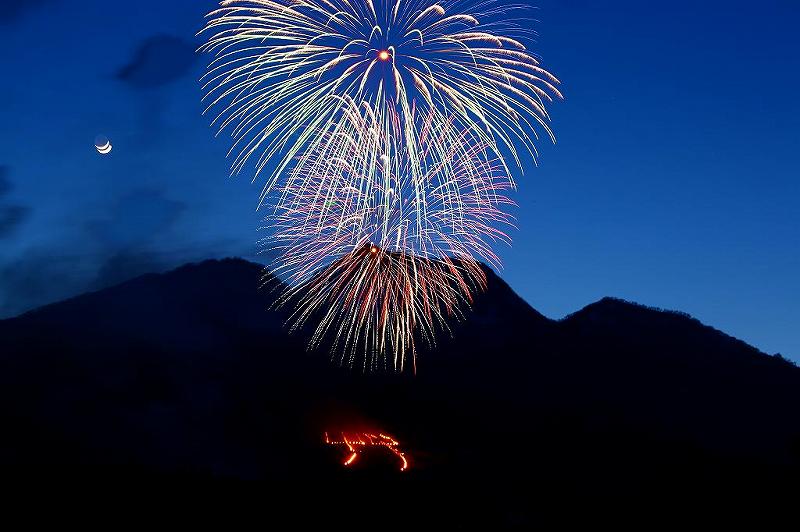 花火は19時からキッチリ上がり、その少し前に「艸」の字に火がつけられ、あっという間に字全体に広まり、ハッキリと読み取れた。ド・アップで「艸」の文字は撮影したのですが、その後の花火は、ことごとく画角オーバー。妙高山の高さスレスレの小さい玉が上がったかと思えば、いきなり尺玉。しかも、19時ならそれなりに暗いと思っていたが、花火の上がる方角が西側、まだ十分に暮れ切っていなかった。適切な露出を探しているうちに露出オーバーの大量生産、帰宅してチェックした結果、まともなのが殆どなし。花火は30分ほどやっていたのに掲載枚数はびっくりする程少なくなってしまいました。