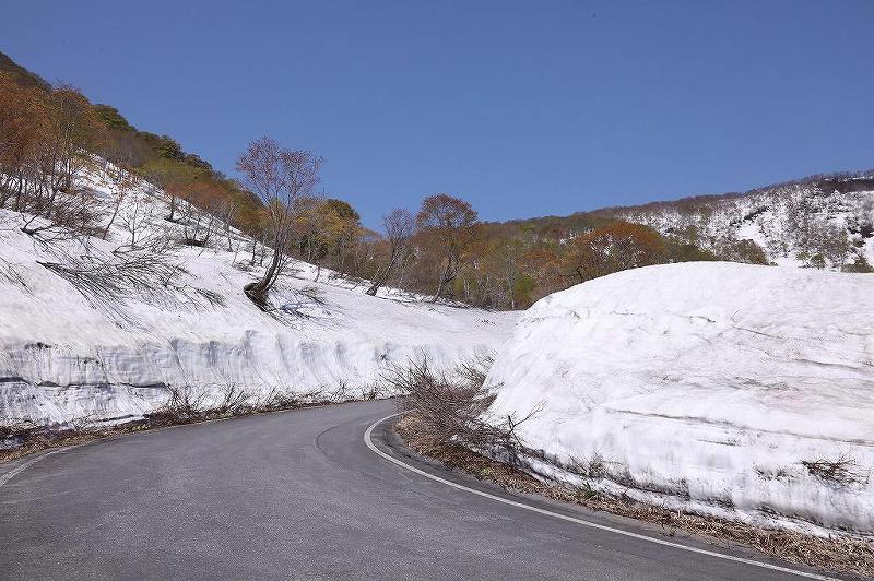ゴールデンウィーク前に開通して県境のチェーン脱着場まで行くことができる。そこ迄は路面も乾き、単なる見晴らしの効くスカイライン。高度を上げるに従って段々両側に雪が残った風景に変わる。そして、大神楽展望台に近づくと車の高さ程の雪壁を見ることができる。蔵王や乗鞍、立山黒部のそれは有名だが、ここはそれとは比べ物にならないくらいマイナーだが、それはそれで「こんなところがあるんだ!」と不思議に感動してしまう。