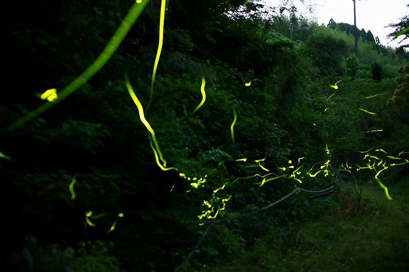気の早いホタルに期待して待っていると、沢沿いの木の葉が発光。正確には、木の葉の上にとまっているホタルが光った。急いで三脚を取りに戻る。セットが終わる頃には5頭ほどが発光していた。沢沿い50メートル程とは言え、何処で飛ぶのかわからないので、取り敢えずは入り口付近で待つ。20時頃には15頭程が飛んでくれた。意外にも沢の上を飛ぶのかと思いきや、ロープを越えて道の上をゆったりと、時には道を行ったり来たり、中には相当高く舞うホタルもいた。このへんは野生のホタルだけあって行動範囲が広い。