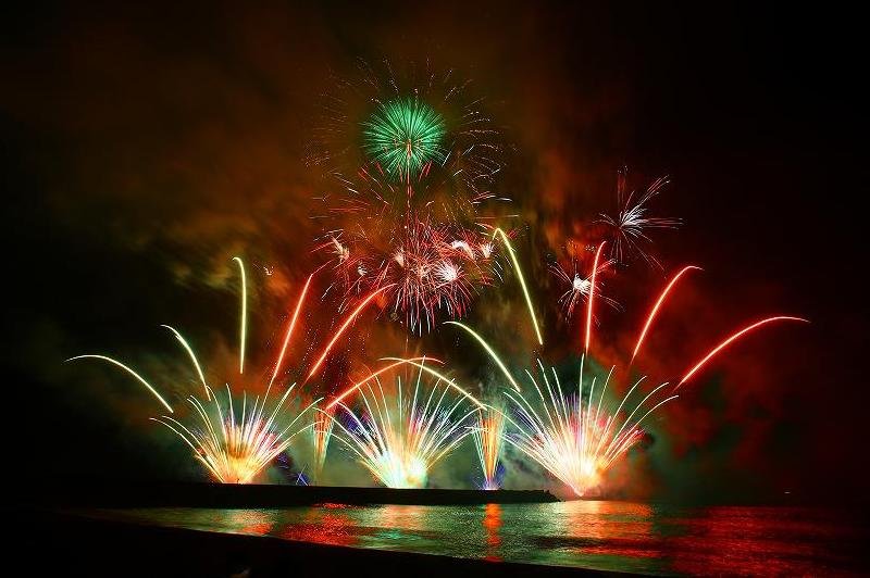 残念ながら、現在5D・MーVの描き込みが不調で使用出来ず。ヒメボタルの時からSDカードへの描き込みが固まってしまい、何度も折角の長時間露光がパーになっていた。今回、代役の7D・MーUだったのだが、24〜105に装着し見事に画角オーバー。元々入りきらないだろうと思っていた5D・MーWに16〜35ミリ横位置が入ってくれたので、なんとか撮影自体は成り立った。しかし、殆ど無風状態(吹いているとは言えない南風)だったので、まともに撮影できたのはオープニング花火のファーストカットのみ。ファイナルに至っては煙の中、花火は殆ど見えなかった。画角オーバーの花火と迫力に欠けた横位置花火、今回が、撮影の稚拙さ、気象条件共に過去2回に比べ一番の不出来。雨が降らなかっただけでも良かったと思うしかない。