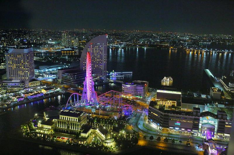 ようやく見つけたエレベーターで46階まで上がる。地上150メートルの眺めは、マリンタワーより若干いいとは思うけど、唯一の欠点はコスモワールドの観覧車がビルと垂直なため、ただの縦長棒にしか見えない。ここは室内の明かりが明るすぎる、トワイライトタイムを過ぎると次第に室内の明かりが明るさを増し行く。その情報も偽りではなく、19時過ぎからの撮影ではなんのメリットもない。同じフロアには飲食店が数軒あり、撮影に飽きた自分らもピザを注文。三脚、一脚、暗幕禁止でも無料なので仕方がない。9時30分頃まで何回も360度周回してみたが、観覧車が丸く見えないこの場所では画竜点睛を欠く作品になるしかなかった。