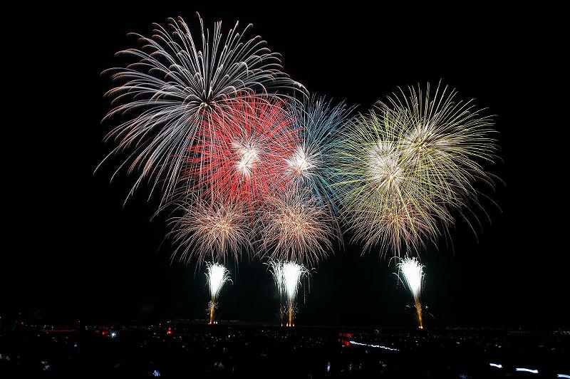 花火の話に戻ります。結果、漁師さんらしき人は、地元の案内人の如く適切な場所を教えてくれた。しかし、3時30分過ぎの時点で三脚が、かなりの数立てられていてスペースはなくなりつつあった。迷っていたら場所がなくなる寸前に近かった。一般観覧者に迷惑がかからない様に、一番後ろの僅かな場所を確保。しかし、後で分かったことだが、左側から上がる10号玉が電線にかかってしまった。しかも右側を撮影場所に取らないと正面に4号から5号が上がり左に10号が上がるパターンなので尚更。打ち上げは4箇所程度。統一性に欠け、プログラムを見ていれば、いつ10号が上がるのかわかるのだが、距離が近すぎる事もあり、終始振り回されっぱなし。ラストの20号は、つい先日熱海海上花火大会で20号が水上爆発した原因がまだわかっていないとかで10号に切り替え。数こそ増えたものの、やはり締めの20号がないのは寂しかった。