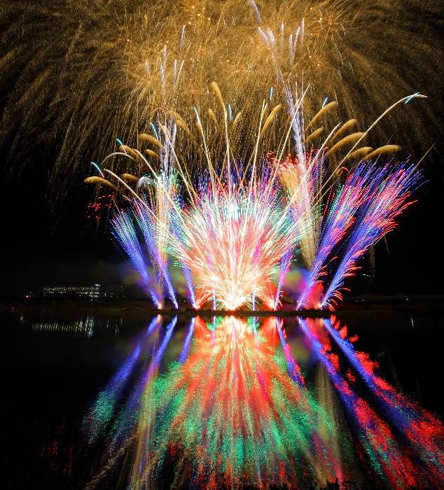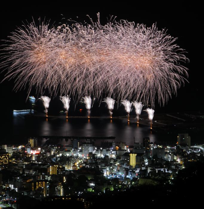 花火内容は2018年とあまり変わらず、花火の明るさはイマイチ。色的にも綺麗とまでは行かず。あまりに近過ぎて、開花はほぼ真上。レンズは水面反射をもう少し入れたかったが、16ミリでギリギリ。良かったのは、天気と風向き、水面反射。18時終了後に熱海へ。