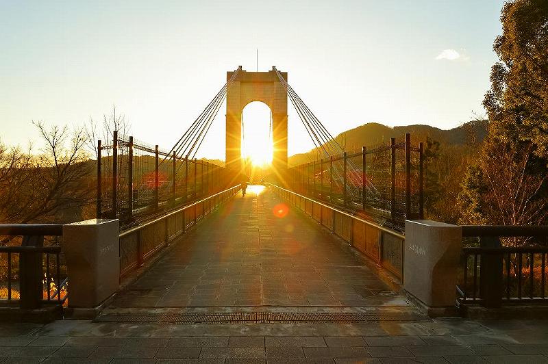 そのせいか、訪れる人もまばらで帰宅も早い。中には、酒を飲みながらイルミネーションを楽しんでいるオッサン連中も。自分は、夕陽が沈む前に到着し、急いで対岸まで橋を渡り逆光をゲット。これって、近藤師匠と同行した時教えていただいた撮り方。橋の袂から水無川に辿り着くも、文字通り水が少ない。水面反射の風の吊り橋の全長が入る「水溜まり」は見つからなかった。