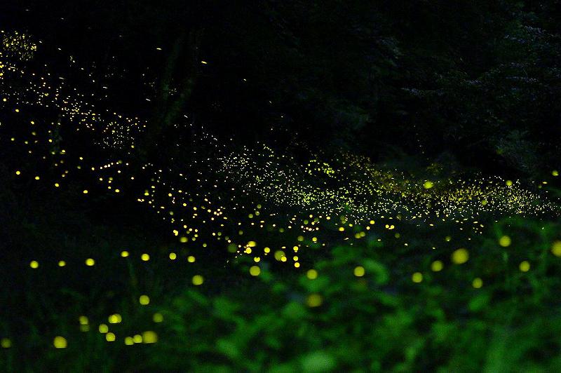 例によって、国道469号十里木CC辺りまで霧に悩まされたが、それも標高を上げると晴れてきた。標高1000m程の天照教社付近からは、富士山登山者の明かりがハッキリ確認出来、星まで見えた。いよいよ夏山シーズン到来か?なんて呑気な事を考えながら期待を込める。この付近、檜か杉の伐採で空き地になっている場所があるのだが(当然立ち入り禁止だとは思うが、錆びたチェーンは張ってあるものの、立札はない。開け過ぎていて明る過ぎるため、ヒメ蛍はいても長時間露光の撮影には向かない。よって、真っ直ぐに伸びた大木の間を飛ぶヒメ蛍を撮影することになる。