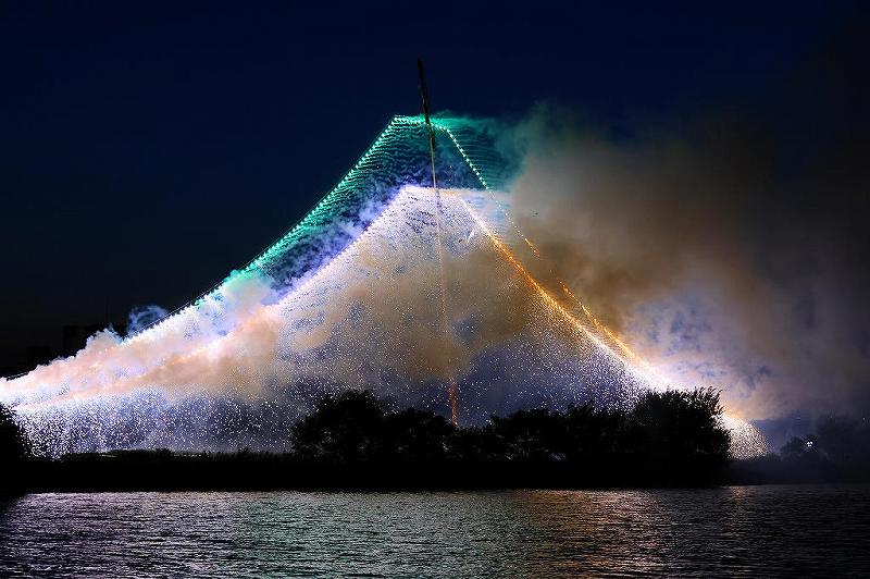 酷暑の中、歩くこと20分。結局「矢切りの渡し」の跡地付近までしか歩けず。体力の限界を感じ、芝生に座っている見物人の邪魔にならなそうな場所に三脚を置いく。ただ、この付近には川淵に柳の植樹があり、枝が垂れ下がり、折からの南風に煽られて、左右に揺ら揺ら、かなり邪魔。そして、いざ打ち上げ開始となると対岸の打ち上げ場所が、かなり右だった。実際には、もっともっと歩かなければいけなかったのだ。花火が右端の枝に被ってしまうほど打ち上げ場所から相当斜め。初めての場所にありがちな失敗。国道6号「新葛飾橋」方向へ更に歩かなければいけなかった。道を間違えて高速道路を浦安まで行ったことが悔やまれる。もっと早く到着しなければ、正面に近い場所の確保もできないかもしれない。お陰でワイドスターマン花火は台形状態。しかも、メチャ近いので湾曲。最低の写真撮影となってしまった。