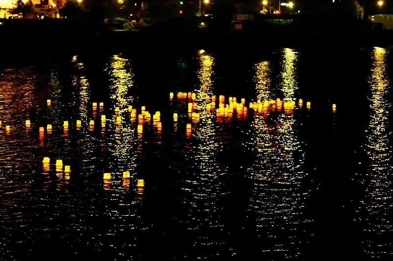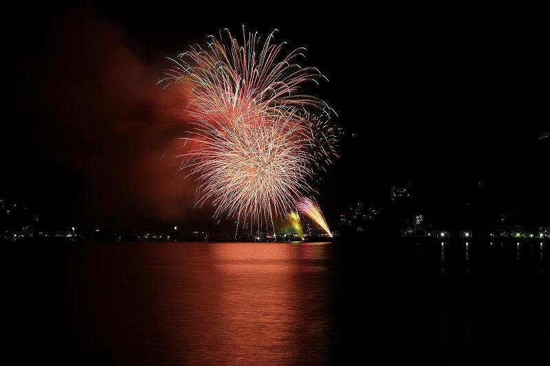 予想通り、花火は湿気で左半分が見えず。時々、雨が降る天気だから仕方ない。多分、他へ行っていたとしても同じ様な状況だっただろうことを裏付ける結果となった。この日、偶然にも幻想的な灯籠流しと多胡湾に並べられた150メートルの篝火が見学出来ただけでも良かった。 |