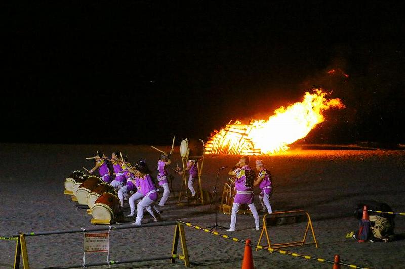やがて御囃子の声が聞こえてきた。小さな神輿が2台、多くの担ぎ手によってオレンジビーチに到着。雨は大粒、にもかからず10分ほど気勢を上げる。神輿にはしっかりビニールが被せてあった。神輿が引き上げると、いきなり照明が消され観客が騒めく。少しして、手筒花火の火柱が上がる。その迫力は、火柱が10メートル近くあるのでは?と思える程、かなりなもの。手筒花火を抱えた勇壮な(と見える)男性数人が、代わる代わるに花火に点火して行く。中には観客との間に張られたロープギリギリまで歩み寄り、警備員に押し返されていたが、彼らの心意気は十分伝わった。