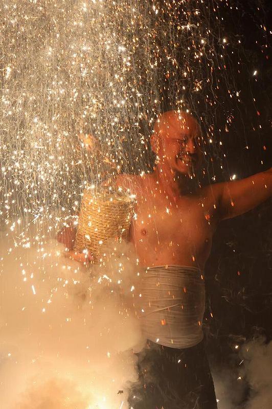 ところが、これをカメラに収めるとなるとかなり難しい。愛知県の「田原まつり」で手筒花火を撮った時は、持ち手はその場に立ったままだったので、ピントも合わせやすかった。今回は歩く。活発に身体を動かす。そして、「田原まつり」の時は薄暮だったが、今回は真っ暗。火を追いかけてシャッターを切る。観客の中には興奮して、スマホを持って突然自分のカメラの前に出てくる者もいた。何よりこの大粒の雨、最悪だ。必死で手筒を抱えて歩く勇姿を追うが、なかなか人物までは上手く写らない。残念ながら、殆どピンぼけ。数枚の成功に喜ぶしか無かった。