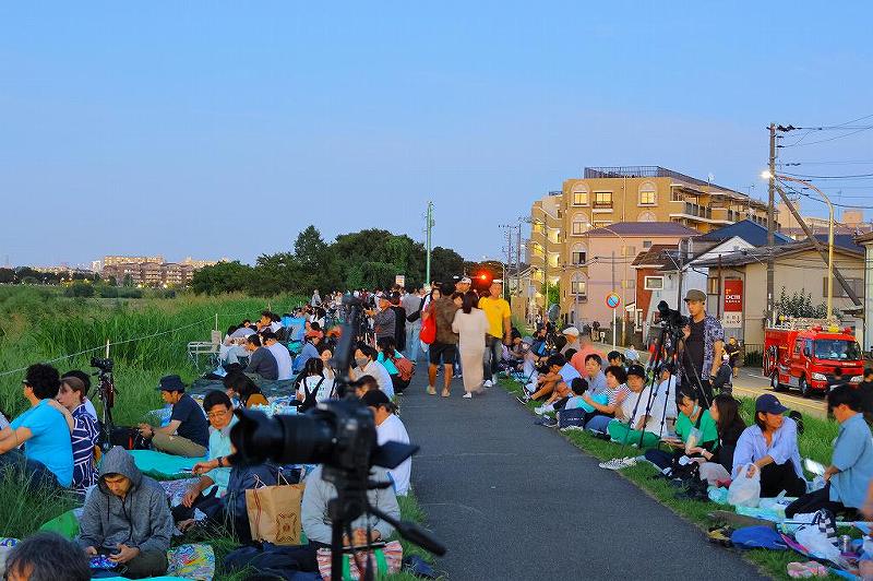 多摩沿線道路「中野島駅入口」から土手に上がる。T氏の指示では右手(下流)に歩けとの事。土手に上がると、既に殆ど場所取りがされていて隙間探し状態。200メートルほど歩いてT氏を発見。彼も特段場所取りに成功した訳ではなく、隙間に割り込む形。並んで三脚を立てるほどの余地はなく、自分も近くの隙間に割り込む。