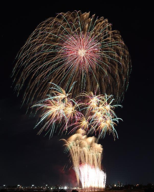 担当は、府中の丸玉屋小勝煙火店さん。やはり、期待通りの花火を打ち上げてくれた。もとより東京調布市の花火大会ゆえ、こちら側はアウェイな訳だから、文句を言える立場にはないのだが、そうでなくても不満は無かった。最大8号玉ではあったが、距離が近いせいか尺玉に近い迫力だった。風が東寄りだったので、T氏の的確な判断のおかげで、稲田堤?矢野口方向に行かなかったのは正解だった。又、余りにも登戸寄りに行くと、河川敷の木が目障りになるので、絶妙な位置をキープしてくれた事にも感謝。それでも、スターマインが斜めなのは仕方ない。もし、風が西から吹いたなら稲田堤まで行くのがいいだろう。そちらからだと水門で堰き止められた川の流れのお陰で、川幅も広くたっぷりと水量を蓄えている。水面反射も期待できる。風向き次第では、来年も候補に入れておこうと思った。逆に言えば、中野島駅入口方向からの写真写りは普通。見るだけなら○。