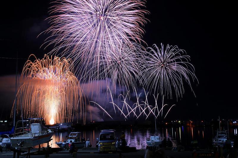 綺麗な夕焼けの後、辺りが暗くなる頃には地元で活躍の「TAK」さんのライブも始まり、芝生席はほぼ埋まった。この場所がどうなのか?焼津海上花火大会でのベストポイントは未だ掴めていない。山の上(高草山)は確かに夜景が華麗で花火もバッチリなのだが、いかんせん焼津は尺玉が少なすぎる。だから完全に街の明かりに負けてしまいバランスが悪いと、個人的には思っている。今回、この場所も車が前を通るし、勿論人も。気にするほどではないが電線2本も遮る。しかも、花火が始まる直前あたりから、漁港関係者以外入らない?はずの岸壁ギリギリまで人が入っていく。海面反射どころか車や見物客まで画角に入ってしまう始末。