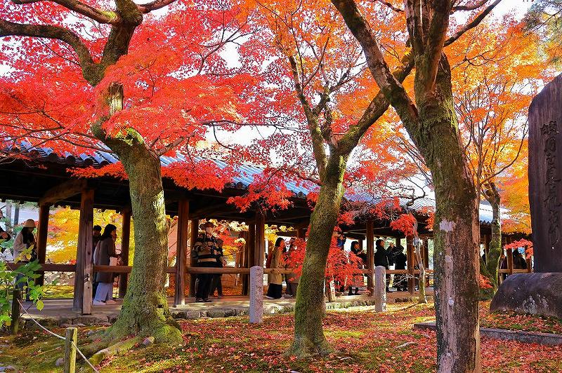 方丈と開山堂を結ぶ通天橋が売り。しかし、拝観受付場所から200メートルの行列。ガードマンが「最後尾」のプラカードを持って案内する。当然、通天橋に繋がる廊下も小・中学校の一斉下校のごとき混雑。廊下の途中で紅葉を撮る事も出来ず。通天橋の中程に少し幅の広い展望デッキ?があるが、何重もの人で撮影の順番待ち。気の弱い自分?は30秒ほどで入れ替わり。おまけに太陽光が強すぎて、半分くらい影。混雑を予想して友人が清水寺を外したのが解ったような気がした。