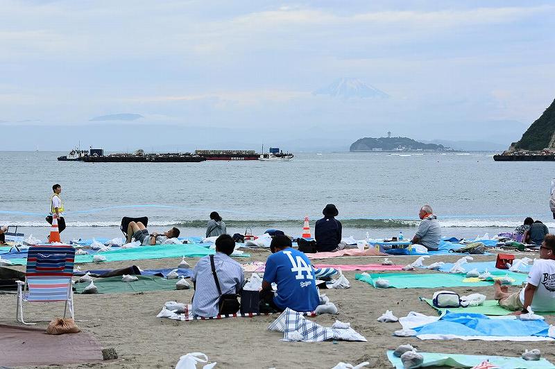 今年はカメラマン席15000円を初め、1.8m四方の一般協賛席11000円など有料エリアの設定で、ひょっとすると美味しい場所がそれに当たり、斜め撮影を余儀なくされるのでは?と期待しないで出かけた。小坪のトンネルを抜け、逗子湾を見るとブルーシートが目に飛び込む。一見かなりの部分が有料エリア設定であるかと錯覚する程。実際、砂浜を歩くと台船の中央に当たる「ステーキ宮」の前は解放されており無料。そして三脚がずらり。カメラ女子が言うには、午前中には埋まっていたらしい。仕方なく少し鎌倉寄りのJCOMが中継の為に場所取りしていた横に陣取る。中央よりやや右だが大した差はない。