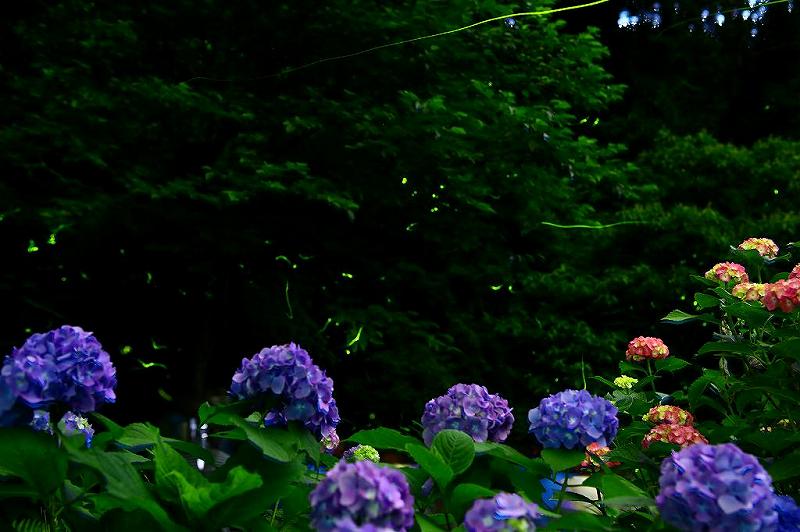 19時20分を過ぎるころから、発光開始。その10分後あたりからボチボチ飛び始め、20時ごろにはかなり高いところまで元気よく飛んでくれた。「クリスマスツリーみたいね!」どこからか聞こえたが、的を得た表現だと思った。漆窪の奥まで行くことができたら、アジサイと源氏蛍のコラボができるのだが、今回はここでそれを試すしかなかった。もっとも、アジサイとカメラの距離が近いのと、アジサイと蛍の距離が少しあるので、自分の腕の悪さではピンボケになってしまった。21時頃になると少しずつ頭数は減り、長く露光していても数は稼げず撤収を余儀なくされた。帰路、数頭飛ぶ場所でカメラを構えるもの、絵にならず。