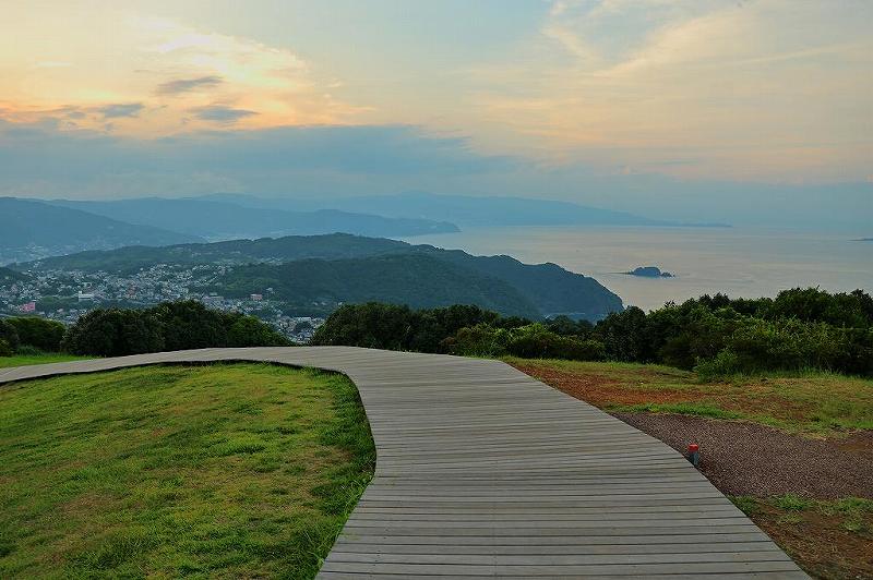 そもそも、小室山自体行ったことがあるのかないのか?記憶にない。よって、展望台からの見晴らしを想像したくても無理。ツツジで有名なことは承知していたが、その先のリフトや恐竜広場は知らなかった。だから、半分観光気分で出かけてみたい気がしたのも事実。山頂駅からの眺めは伊豆の中でも一二を争うとか?リフトは16時終了。歩くしかない。尤も三脚とリュック持参ではリフトが運航されてても乗れないかも知れない。徒歩ルートの案内には800mを20分とある。しかし、自分は30分かかった。汗びっしょり、息絶え絶え、しかも左足も部分的ではなく全体的に痛い。花火の打ち上げは20時なので急ぐ必要はないのだが。アスファルト舗装はしてあるので、10m歩いては休み、勾配のキツい場所は5m歩くのがやっと。しかし、頂上に辿り着いた時、いきなり360度の展望には驚いた。そして、汗びっしょり故の寒いくらいの心地よい風。景色を眺めに来ただけでも価値はあった。