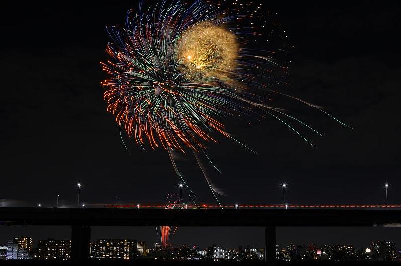 実際、花火が打ち上がってみると首都高速の向こう側に上がる花火は、それほどの高さもなく、勿論大きさも小さい。それよりも強風で形を成さず。散々な花火大会だった。花火だけならボツに近い撮影ですが、夜景が大変華麗なので、そちらを楽しんでいただけたらと思います。 |