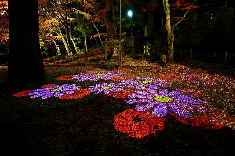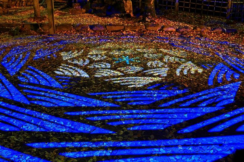狭い範囲ではあったが、落ち葉の上にプロジェクトマッピングが施され、この神社の四季の移り変わりを映し出していた。2回ほど場所を変えて撮影した後、いよいよライトアップ撮影。とは言っても神社の一部しか照らされていない為、それほどの題材も無かった。昼間の美しい赤色は、ライトアップで返って綺麗で無くなってしまった。と言ったら叱られるかも?時間が経つにつれて見物客も多くなって来たので、早めの切り上げとした。 |