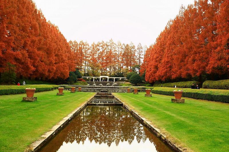 メタセコイアは高島市マキノ町で日本初として植えられた。それを見てしまっているので特別な感動はない。ただ、相模原公園の様に本数こそ少ないものの(97本)メタセコイアに囲まれる様に、ルイ14世時代に始まるフランス式庭園(左右対称、大きな池、花壇、トピアリー(植木を刈り込んで作られた造形物)そして、権力の象徴としての運河を模した水路と噴水)が中央に整備された公園は、また一味も二味も違った雰囲気があります。