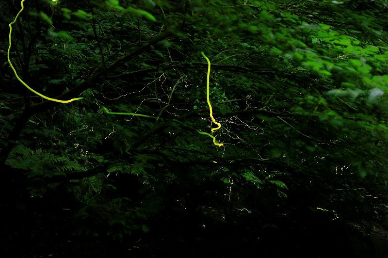 振り返ればヘイケボタルが、沼の上を飛んでいるではないか!流石にびっくりした。その数が多いのだ。その光は弱く、点滅も完全に消えるわけではなく光の強弱的継続発光。初めはヘイケボタルだけが水面近くを飛んでいたのだが、やがて上方から源氏ボタルが降りてきて乱入。この2種類を同時に撮ると光の強さにかなりの差があり、少しバランスが悪い。