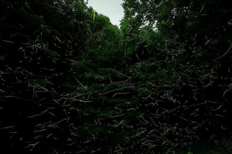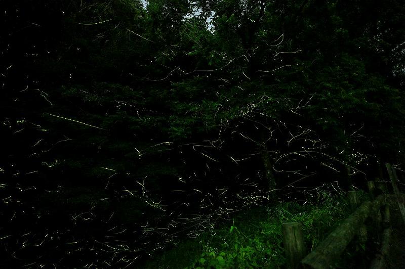 手前を流れる小川の上を飛ぶ源氏ボタルが、後方の10m近い林をバックに高く飛ぶ。時には、その林の更なる上を飛翔することもあった。見学に訪れた人の何人かから「クリスマス・ツリー」のワードが聞かれた。そう!ホタルを電飾に例えているのだ。今回は、自分もそのイメージが強かったので、たとえ空振りに終わってもこの場所一択で、カメラの位置、角度、画角を色々と変えながら、木立を背景に飛ぶ源氏ボタルの撮影に徹した。