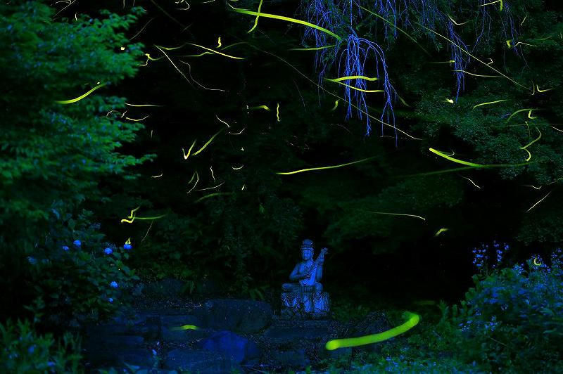 飛翔は「人道橋」から下流より上流の方が多い気がした。渓流のようになっている下流では、蛍は木の付近近くの飛翔のみで、川面付近までは降りてきてくれず。すっかり予想を外してしまい、大失敗。これも初めての場所ゆえのご愛嬌か?上流側右手、琵琶を弾く石像あたりを狙った撮影はそれなりの成果はあった。ただ、見学者のクルマのライトがモロに入り込むので要注意だ。