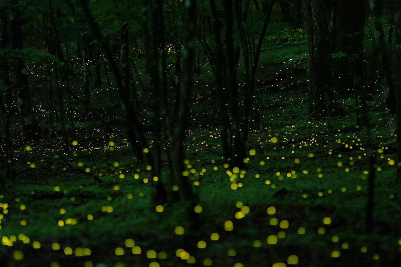 3年ぶりに藤沢のK氏と待ち合わせて西臼塚へ出かけた。なんと待ち合わせ時間が16時30分!飛ぶのは早くて22時過ぎ。彼の気構えには脱帽!もっとも、本来なら当然の事か?まだ明るいうちに場所決めをし、三脚設置。次にAFでもMFでも良いので焦点を合わせる。テープで固定。特にヒメボタルの場合ピントがボケると最悪(よく、やらかしてます)。一旦車に戻り19時に再び設置場所へ。ブルートーンを狙ってベースの景色を撮影。再び車に戻り22時に本番。30秒刻みでシャッターを切る。これが彼の撮影の仕方。そして、自宅等へ帰りパソコン入力。100枚くらい重ねるのか?出来上がりは黄金の絨毯!