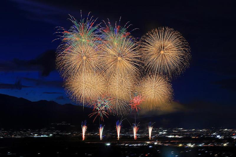 2尺玉がなくなったせいではないとは思うが、今年はいつもより場所の取り合いは緩和されていたようで、開始30分時点でまだ多少のスペースが残っていた。昨年とほぼ同じ場所からの撮影だったが、終了後、知り合い5人が、異口同音に「(昨年に比べて)今年は良かった!」と感想を述べていた。確かに2尺を除けば、一昨年と同じ位の感動を与えてくれた。珍しく笛吹川を渡る風が殆ど無風に近かったにもかかわらず、打ち上げ開始後も煙害は多少ある程度におさまってくれ、大変美しい花火を鑑賞する事ができた。