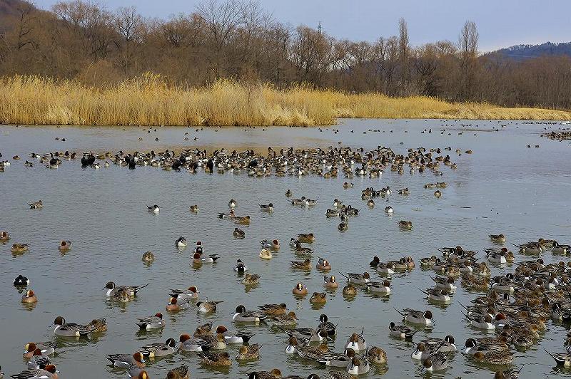 ナビで案内された場所には、犀川白鳥湖同様小屋はあったが、白鳥は4羽しか見当たらなかった。その代わり湖面を埋め尽くすばかりのカモがいた。種類も色々でよくもこれだけビッシリ埋まった(集まった)ものよ!変な感動を抱きながら池を一周。諦めて帰ろうとしたは小さな立札に「白鳥は5分ほど歩いた上流」と書いてあった。矢印がないので、どちらが上流なのか?「矢印ぐらい入れとけよ!」と思ったけれど勘繰るに、ハッキリした場所を教えたくないのでは?