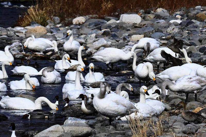 急いで(急ぐ必要もないのだが)三脚にカメラをセット。車を止めた場所から白鳥がいるこちら側の岸まで50mほど。逃げられたらと思うとあまり近づけない。用心深いのが数羽飛び立ち、少し離れた対岸の流れの緩やかな場所まで飛ぶ。確かに2箇所合わせれば50羽は下らない。撮影当初は誰も居らず、穴場?と思ったが、寒さに耐え切れなくなって20分程で退却する頃には、カメラマンが2名、カップルが1組訪れていた。