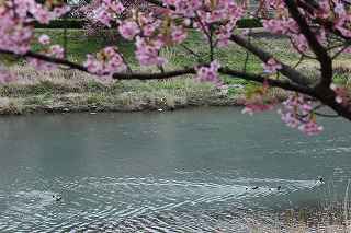 | 5.青野川の桜並木 | 6.川には鴨の親子がスイスイと |