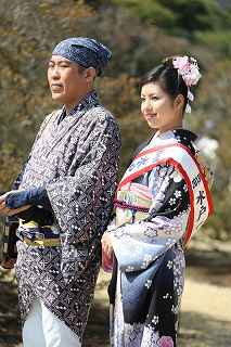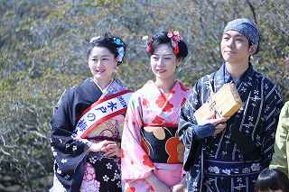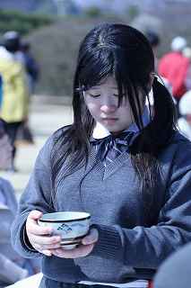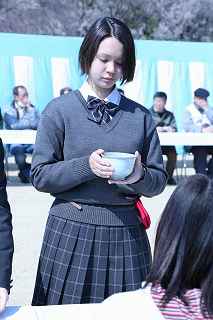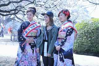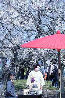 梅祭り期間中沢山のイベントが開催されている。 3月上旬には、夜梅祭も開催されていて、この時は花火も打ち上げられるのだが、如何せん肝心の梅の開花がさっぱりで、二の足を踏んでしまった。 売店付近の広場では水戸黄門の御一行様や、美しい梅をあしらった和服姿の水戸梅大使に出会うことができました。どちらも、観光客と一緒に記念撮影をすることが出来、順番待ちの長い列が出来ていました。 そのせいか梅大使の女性たちは少々お疲れ気味の顔をしていました。 又、大成女子高校の生徒の皆さんによる野点茶会も行われていて、最近見慣れてしまったミニスカの女高生でない「大和なでしこ」にシャッターをきってみました。