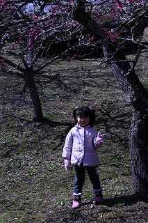 | 1.私が「梅の花と富士山を紹介しますね」と、将来の梅娘が・・・案内のポーズをとってくれる。 | 2.男坂(右手)を登ると、ミツバツツジが咲いてます |